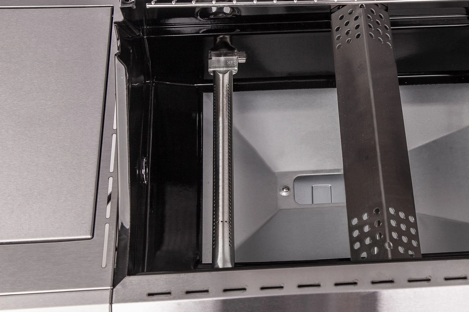 Einen weiteren genialen und super praktischen Brenner haben wir auch in unserem Einbaugrill G591G integriert: Den Infrarot – Heckbrenner bzw. Spießbratenbrenner. Dieser Infrarot-Backburner ist im hinteren Bereich des großen Garraums montiert und gibt die Hitze nicht als Konvektionshitze (wie von Rohrbrennern) ab, sondern direkt von hinten als Infrarothitze.